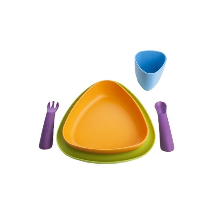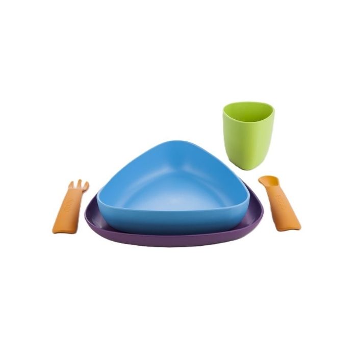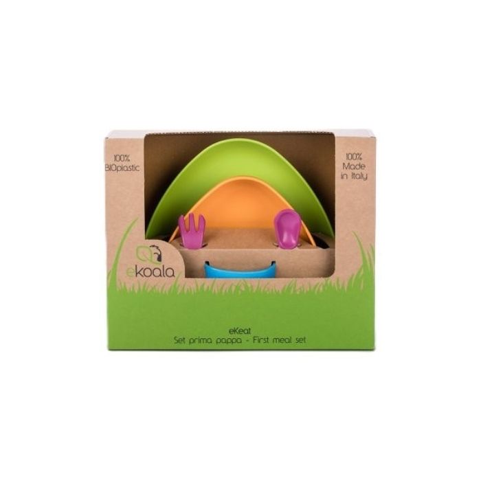 Il set pappa eKeat è pensato per rendere il momento del pasto divertente e sicuro. Include piatto piano, piatto fondo, bicchiere, cucchiaio e forchetta, tutti realizzati in bioplastica vegetale derivata da risorse rinnovabili. Il design è ergonomico, adatto alle piccole mani dei bambini, e il materiale è resistente ma leggero. Il set è colorato in tonalità allegre, stimolando il bambino a mangiare in autonomia e in sicurezza.