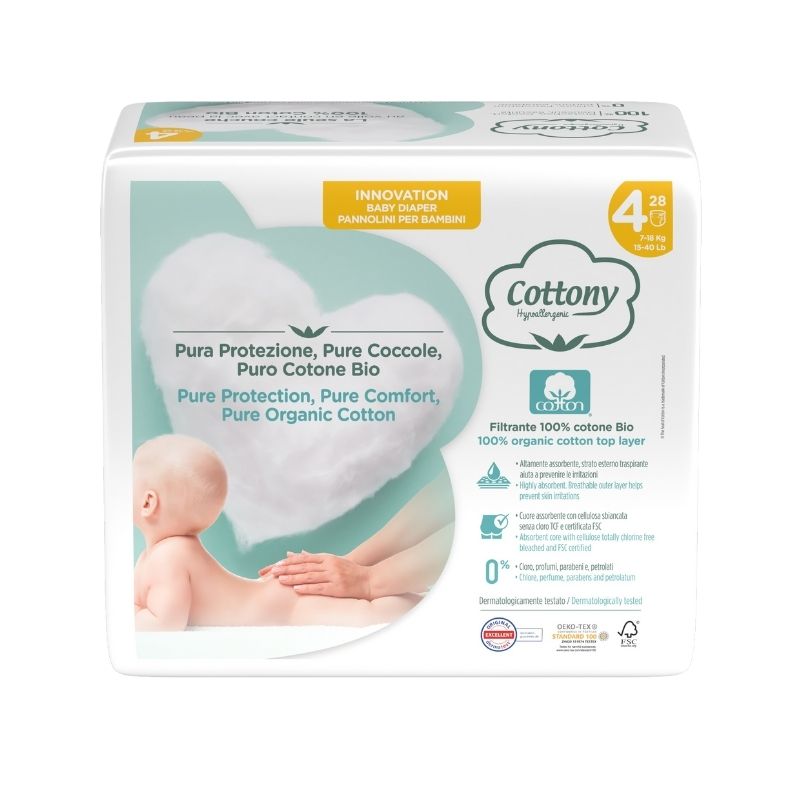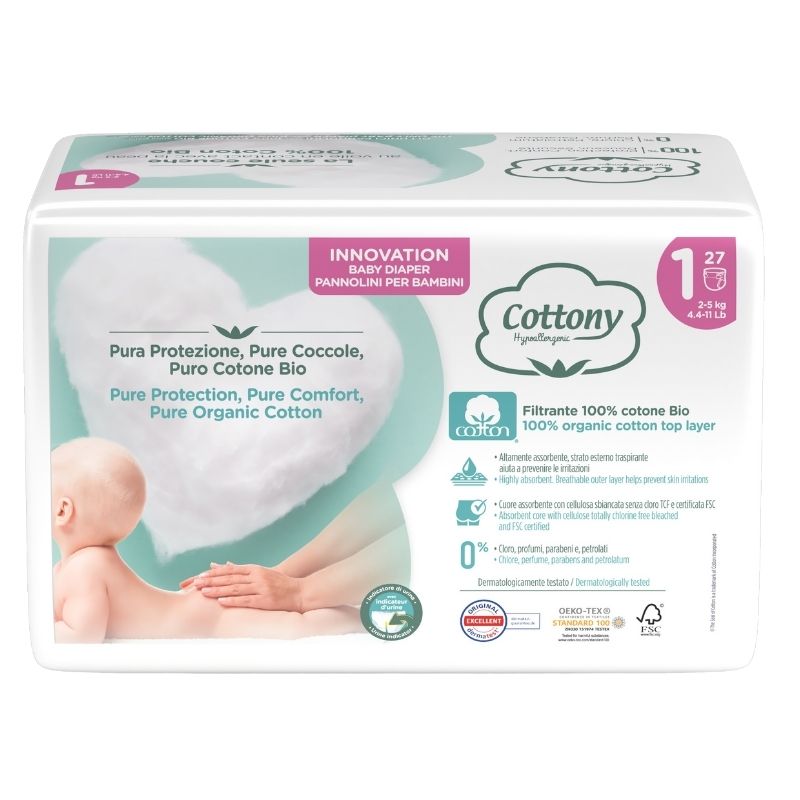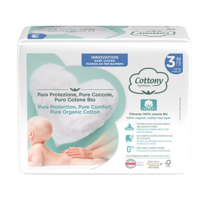 Il pannolino Cottony Baby è pensato per coccolare la pelle più sensibile: a contatto con la pelle c’è uno strato filtrante completamente realizzato in cotone biologico, che aiuta a prevenire irritazioni e arrossamenti. All’interno, un nucleo assorbente in cellulosa TCF (sbiancata senza cloro) trattiene efficacemente i liquidi, mentre le barriere laterali garantiscono protezione e impediscono le fuoriuscite. Il design è studiato per essere morbidissimo ma anche sicuro: la chiusura in vita è regolabile per vestire bene il bambino e c’è un indicatore di umidità che segnala quando è il momento di cambiare il pannolino (presente solo nelle taglie piccole 1 e 2). Il lato esterno è in tessuto non tessuto micro-perforato, che lascia respirare la pelle e mantiene il pannolino traspirante.