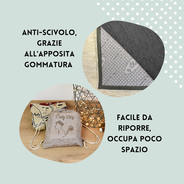 Il tappeto BabyCity Dinamico è molto più di una semplice superficie su cui giocare: è stato progettato per stimolare la creatività e lo sviluppo motorio del bambino grazie al suo percorso “città” dipinto sulla superficie. Potrai usarlo sia dentro casa che all’aperto, perché ha un retro antiscivolo che lo mantiene stabile anche su superfici lisce. Leggero e pieghevole, viene fornito con un pratico zainetto colorato per portarlo facilmente al parco o usarlo in viaggio. Al suo interno c’è anche un libretto con tante idee di giochi educativi (forme, numeri, animali …) per divertirsi insieme e imparare giocando. Il tessuto è morbido, piacevole al tatto, e il tappeto è realizzato in Italia con materie prime certificate.